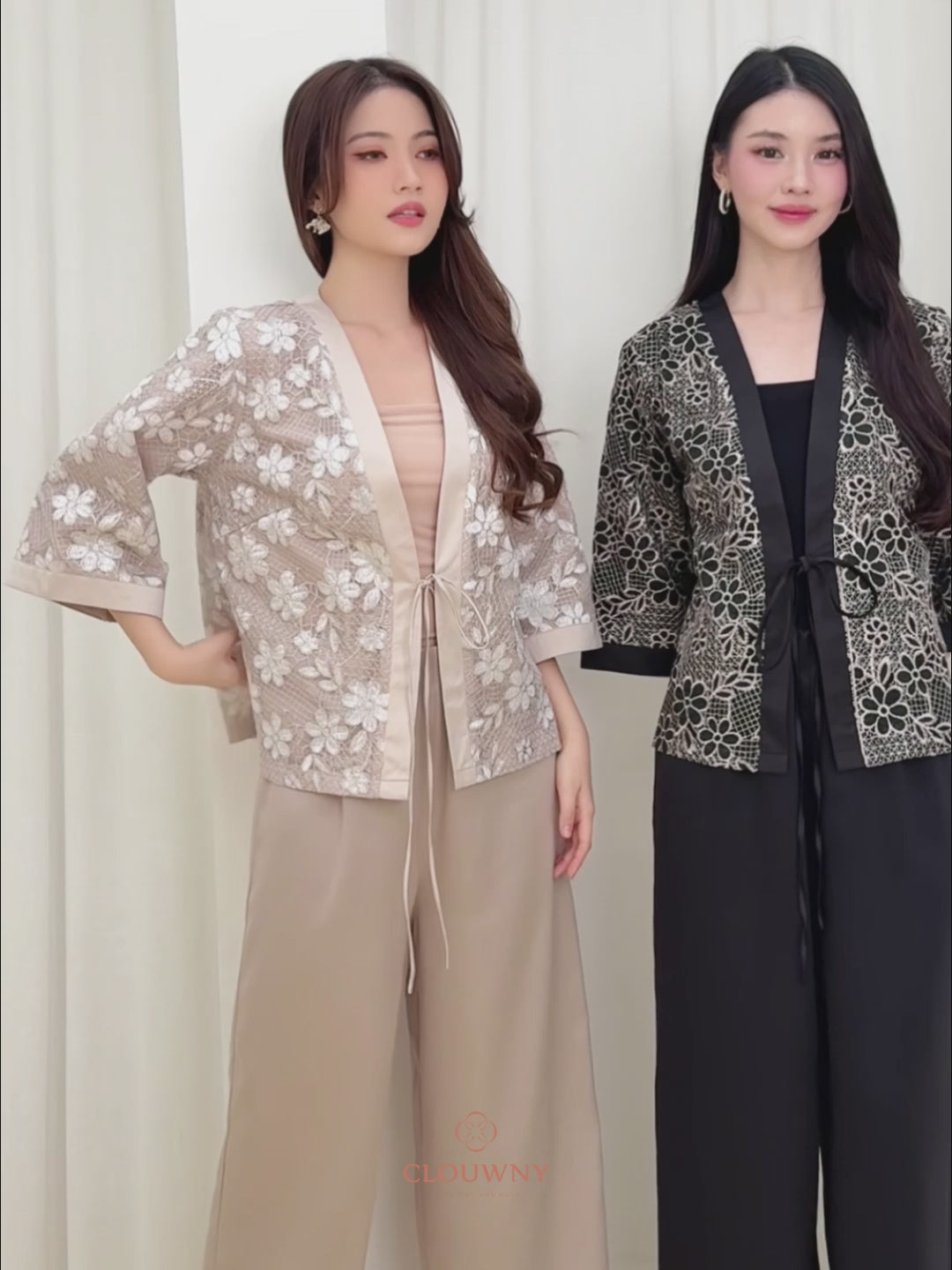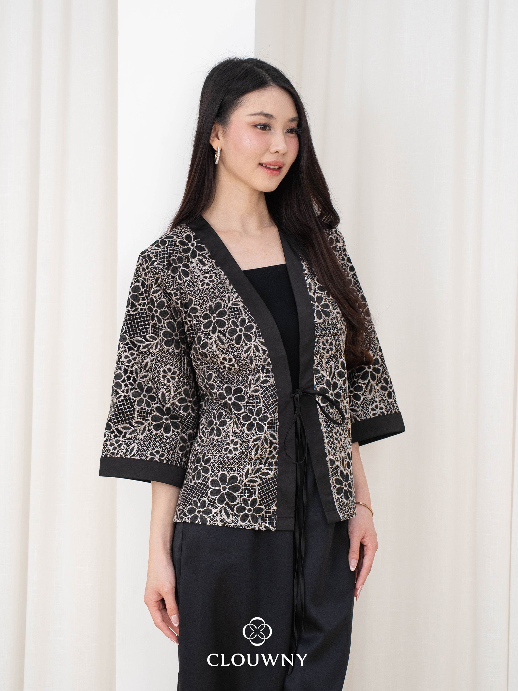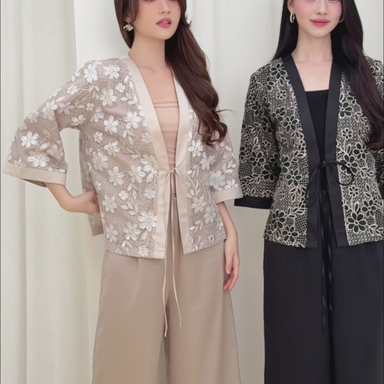 Elegant kimono featuring delicate floral lace detailing that brings timeless sophistication to any wardrobe. The flowing silhouette and intricate flower patterns create a graceful, feminine look perfect for special occasions or layering. Crafted with attention to detail, this piece combines traditional kimono style with modern elegance for versatile styling options.